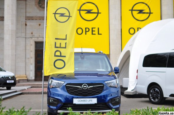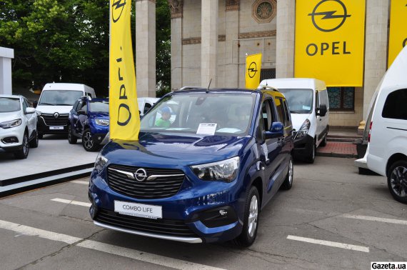 Opel Combo Life синього кольору поставили перед Movano. Незважаючи на те, що авто має відому платформу PSA, воно має самобутній вигляд. Опелівського стилю додають фари та хромовані промені від емблеми.