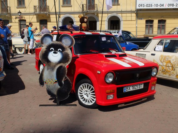 Попри це чи не найбільше охочих хотіли сфотографуватися біля звичайних червоних "Жигулів" з олімпійським ведмедем на даху машини. Для презентації свого авто хмельничанин Сергій Мальцев обрав стилістику Олімпіади 80-го року. Відповідно до спортивної тематики одягнулася і родина автолюбителя: кросівки, шорти та червоні футболки.