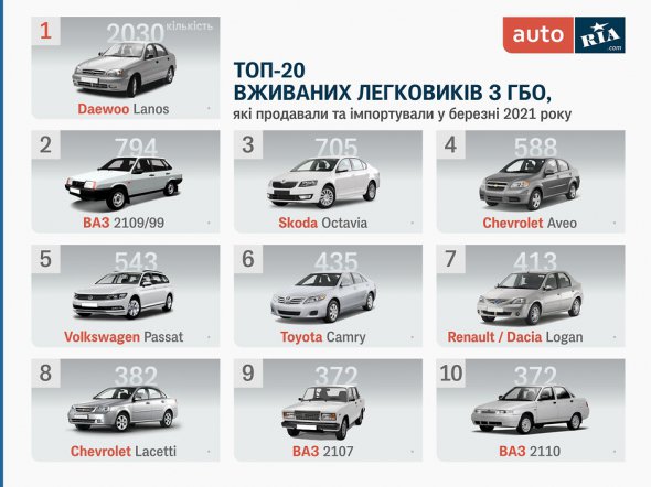 Легкові авто з газобалонним обладнанням займають приблизно 1/5 вторинного ринку в Україні. Згідно з відкритими даними ГСЦ МВС про кількість угод купівлі-продажу й перших реєстрацій, загальна кількість таких авто в березні становила 22,8 тис.