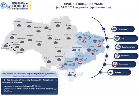У Харківській, Луганській, Донецькій, Запорізькій та Херсонській областях сильні пориви вітру, хуртовина та ожеледиця.