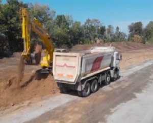 На ролику помітно, що частина першої в Україні бетонної траси уже прокладена, а на невеличкому відрізку дороги працюють одразу 4 екскаватори.