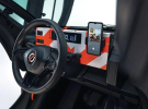 Салон організовано лінійно. Пасажир розміщується позаду водія. Приладова панель електромобіля вузька і цифрова. Замість мультимедійного екрану використовується смартфон, який підключається через USB.