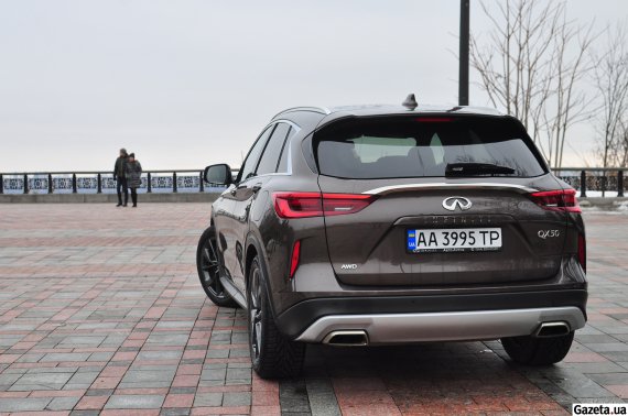 Коричневий Infiniti із панорамним дахом і закритими дзеркалами стоїть на паркінгу. У нього 20-дюймові колеса і кліренс 22 сантиметри. По всьому контуру нижньої частини кузова встановлені пластикові накладки. Капот, як і в інших Infiniti, - дутий, із двома різкими ребрами жорсткості. Але коротший, ніж в попередніх моделях. Цьому посприяло поперечне розташування двигуна.
