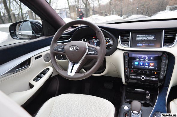 На заміській дорозі кросовер добре керований. На швидкості 130-140 км/год відчувається запас потужності. На Бориспільській трасі випробовую круїз-контроль. Він адаптивний — якщо автомобіль попереду знизить швидкість, QX 50 також пригальмує. У такому режимі їзди витрата палива мінімальна — 7,6-8 літрів. У місті у нормальному режимі машина споживає до 11 літрів пального.
