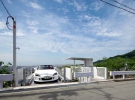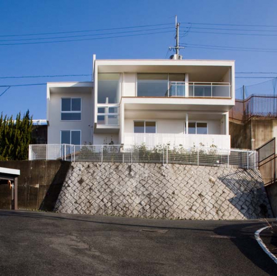 Будинок в Японії, спроектований архітектором Кенже Янагава, розташований на 5-метровому схилі. Візуально можна розділити будівлю на три рівні: верхній (дах) є місцем для в'їзду автотранспорту, середній - перший поверх і нижній - цокольний.