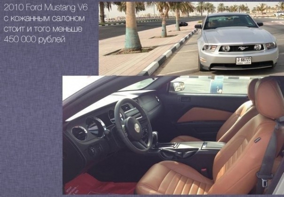 Ціни на вживані автомобілі в Дубаї дивують своєю доступністю. Згідно з тамтешніми оголошеннями, Dodge Challenger R/T V8 у повній комплектації коштує у гривневому еквіваленті лише 147 тис., Dodge Challenger V6 - 112 тис., Chevrolet Camaro V6 - 144 тис., Ford Mustang зі шкіряним салоном - 108 тис.