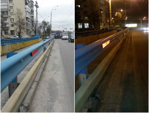 "Забезпечення додаткової видимості огородження на штучних спорудах дасть можливість водіям своєчасно зорієнтуватися вночі або при несприятливих погодних умовах та сприятиме підвищенню рівня безпеки руху на вулично-дорожній мережі столиці", - йдеться у повідомленні.
