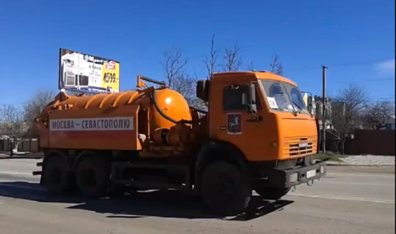 Всі автомобілі цивільного призначення і являють собою комунальну техніку, пожежні спецавтомобілі, маршрутки, міські автобуси і фури з гуманітарною допомогою. На деяких машинах красуються транспаранти "Москва-Севастополю".