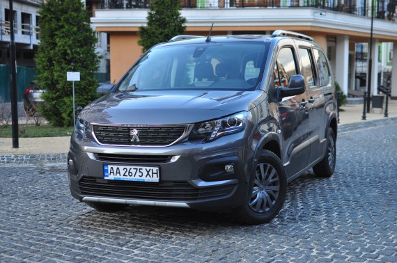 Коричневий мінівен припаркований біля представництва виробника на столичній вул. Кирилівській. У машини короткий капот. Лицева частина — в стилі останньої генерації моделей Peugeot — із затемненими блок-фарами з вертикальною світлодіодною стрічкою і хромованим обідком навколо решітки радіатора. Традиційно для марки блокфари трохи заглиблені в кузов, що створює ефект легкої агресії.