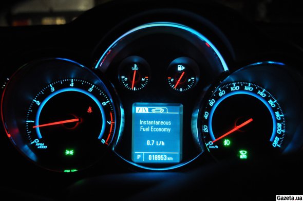 Тисну на гальма і заводжу машину кнопкою. Шуму двигуна практично не чутно. Переводжу важіль коробки передач у режим "драйв" і тисну газ. Педаль газу дуже чутлива. Після досягнення 50 км/год вмикається турбіна — авто розганяється швидше. Тяги двигуна вистачає із запасом. Навіть із вантажем і чотирма людьми в салоні Cruze добре прискорюється, їдучи під гору.