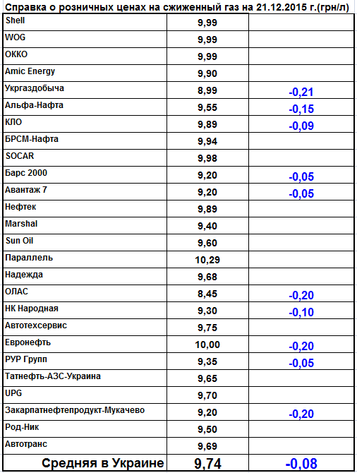 Протягом 19-20 грудня в більшості мереж АЗС і АГЗС вартість скрапленого газу впала на 5-21 коп. за літр. Зараз літр такого палива для авто продають всередньому за 9,74 грн, повідомляє консалтингова компанія UPECO.