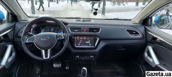 Огляд із водійського місця JAC хороший. Краще видно простір попереду, ніж у японському "Ніссан Ліф" за рахунок високої посадки і тонших стійок кузова. Бічні дзеркала великі й добре захоплюють простір позаду. Паркуватися допомагають камери. Графіка екрану не нарівні найновіших машин, але отримати потрібну інформацію можна. Крім того, є змога контролювати розміщення машини з висоти або переходити до збільшення зображення у секторах, видимості, які найбільше цікавлять.
