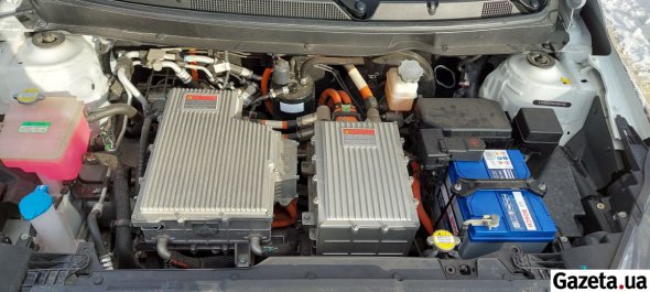 Підкапотний простір організований логічно і зрозуміло. Окрім того, що тут встановлений електричний двигун, він нічим не відрізняється від моторного відсіку бензинових машин. Тут легкий доступ до бачка омивної рідини скла, бачка гальмівної рідини, охолоджучої рідини акумулятора та стартової батареї німецького виробника "Бош". Вона потрібна для роботи периферійної електроніки.