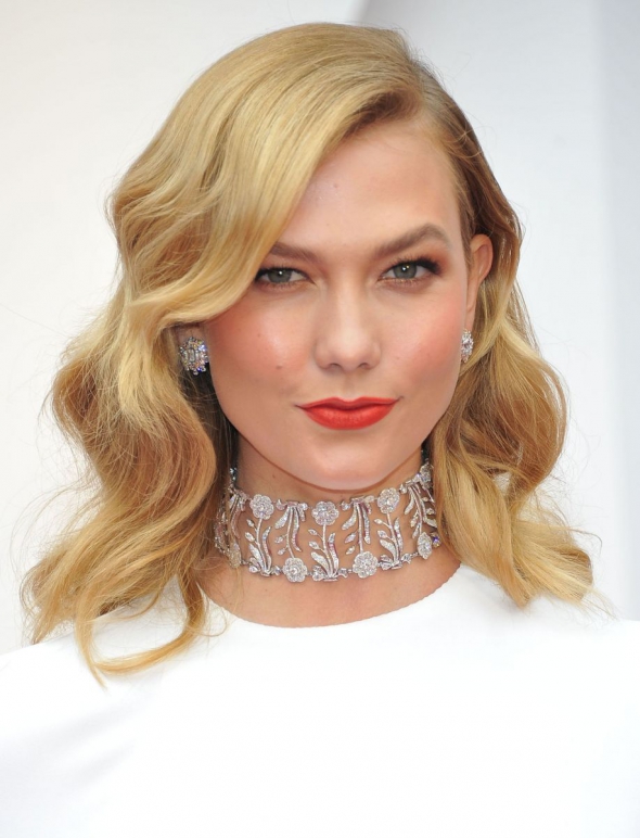 Супермодель обрала класику - волосся укладене в легкі хвилі на один бік. Макіяж виконаний переважно в пастельних тонах. Візажист підкреслив чуттєвість губ моделі за допомогою помади ніжно-коралового відтінку, вилиці підсвітив рум'янами та хайлатером.