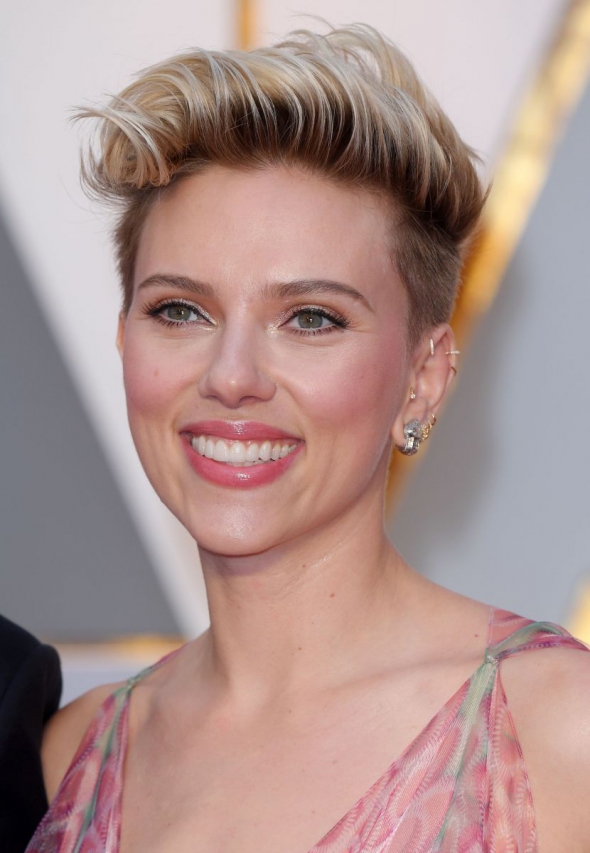 Голлівудська зірка Скарлетт Йоханссон обрала для виходу ніжно-рожеву гамму. Макіяж актриси був виконаний в ніжних рожевих відтінках - очі підкреслені сяючими тінями рожевого відтінку, вилиці виділені світло-рожевими рум'янами. Макіяж губ - напівпрозорий блиск з рожевим підтоном.