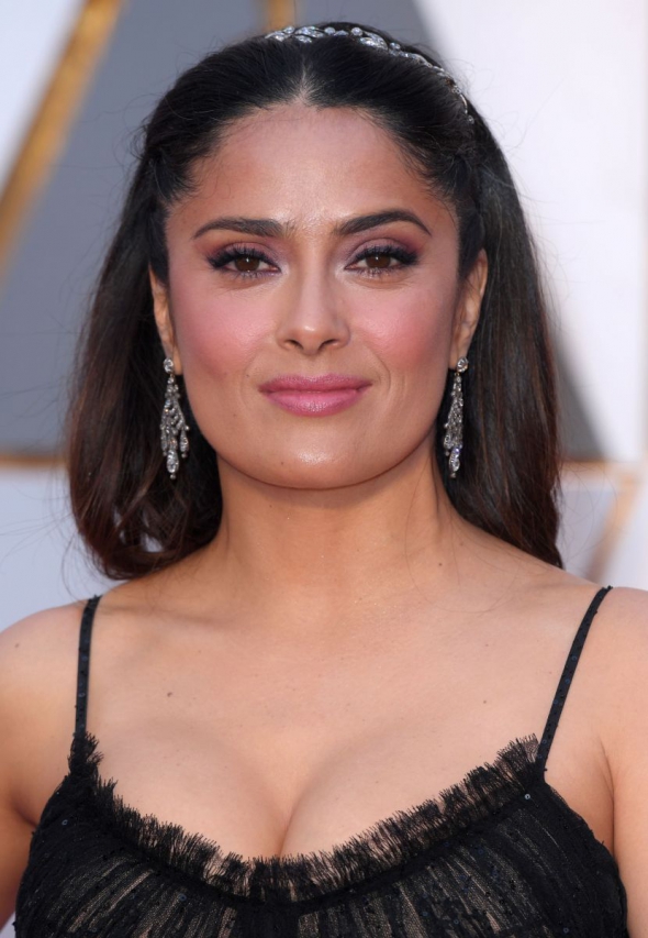 Сальма Хайек підкреслила красу очей за допомогою класичного смокі-айз. Б'юті-образ доповнила хайлайтером та рожевим блиском для губ.