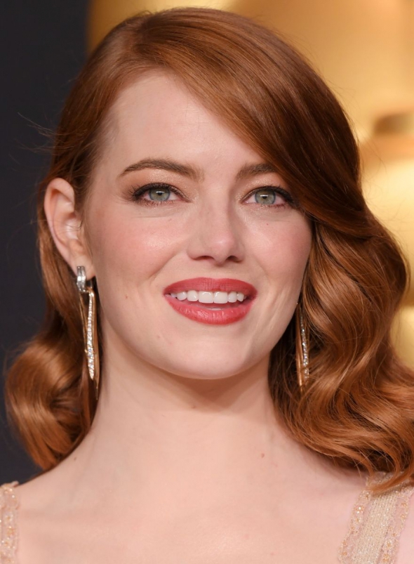 Акторка Емма Стоун з'явилася на публіці з зачіскою в стилі ретро-Голлівуду. Вдало гармоніювала з макіяжем у димчастому смокі айз з помадою рудо-коричневого відтінку.