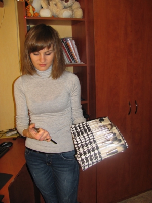 "Щоб зробити хороший макіяж самому, вистачить 5-6 штук, - пояснює візажист Марина Романченко, 24 роки. – Одна щіточка для пудри, одна для рум'ян, ще треба для розтушовки тіней, гелевої підводки. Обов'язково потрібна пласка щіточка, нею дуже зручно наносити основний колір тіней на рухомі повіки. Дехто ще окремо купує щіточку для тонального крему. Макіяж , зроблений за допомогою щіток, більш насичений і чіткіший".