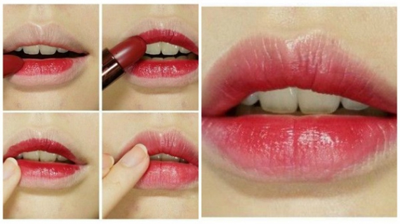 Спочатку слід висвітлити губи тональним кремом та припудрити обідок. Зверху нанести блиск або помаду по центру губ. Розтушувати пальцем або пензликом.