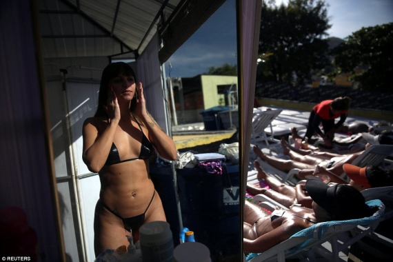 Бразильські жінки лежать напівоголеними на даху, аби отримати ідеальну засмагу. Під сонцем листопада жінки одягають крихітні бікіні. Зроблені з маскувальних стрічок, що приклеюються на тіло.
