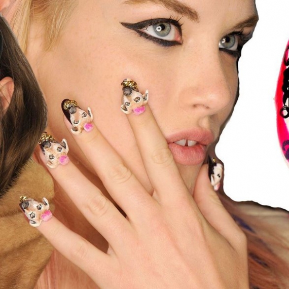 На нігті моделей прикріпили 3D-зображення мордочок собак, штучне хутро, портрети з короною, золоті ланцюги.