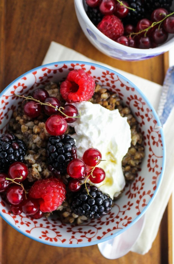 Інгредієнти: 3 ст. л. гречки, жменя ягід, 1 ч. л. меду, 1 ст. л. грецьких горіхів.