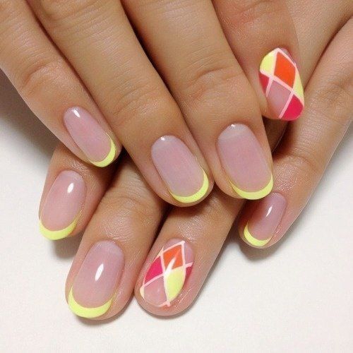 Дизайни з кольором сонця виглядають дуже ніжно та жіночно. Можна додати каміння, зробити френч або прикрасити нігті візерунками. Також популярним стало поєднувати різнокольорові стрази та викладати з них фігурні малюнки.