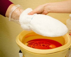 "Парафінотерапію можна провести вдома. Для цього потрібна трилітрова каструля з широким дном, 1,4 кілограма лікувального парафіну, харчовий термометр, а також целофанові пакети і махрові рушники. Парафін розтопити в каструлі і охолодити до 50 градусів. Зняти всі прикраси з рук, вимити руки і опустити в каструлю з парафіном, потримати кілька секунд і витягти, дати стекти надлишкам парафіну. Процедуру треба повторити 7-10 разів, - радить косметолог. - Потім покрити руки або ноги целофаном і обернути зверху рушником. Коли парафін охолоне, знову помістити руки в парафінову ванночку на 30 хвилин. Парафін охолодити на руках, облущити і зберегти для наступної процедури".