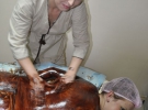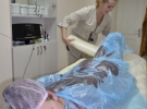 Масажистка Марина Водяну, 32 роки, спершу наносить на тіло скраб, щоб прибрати відмерлі частки шкіри. Потім змиває засіб зі шкіри й починає наносити густий теплий шоколад, одночасно погладжуючи та розминаючи тіло клієнтки. На одного клієнта витрачає 300-500 г суміші. Далі загортає в поліетилен на 15-20 хв.