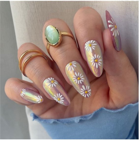 Такий варіант пасуватиме для вечірки чи ефектних світлин у соцмережі. З морською засмагою хромовий манікюр підкреслить і виділить її ще більше. Особливо ефектний вигляд має синій хром. А ромашки поверх хромованого покриття - це найбільш літня ідея.