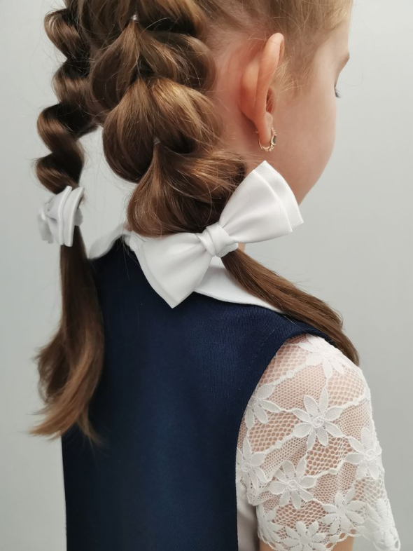 Два симетричні хвостики з великими бантиками - це завжди "вау"-ефект на лінійці. Можна додати легкі локони або зробити хвостики гладкими.