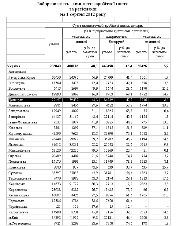 Найбільша заборгованість за станом на 1 серпня спостерігалася в Донецькій (179 млн 197 тис. грн) та Харківської (114 млн 373 тис. грн) областях, найменша - у Чернівецькій (121 тис. грн) та Рівненській (2 млн 83 тис. грн) областях.