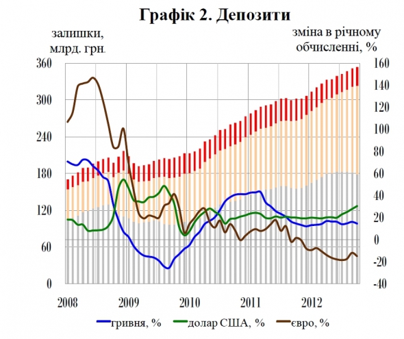 Темпи приросту депозитів у національній валюті становили 14,8%. Темпи приросту в доларах США удвічі більші - 30,6%. Падіння відбулося за рахунок депозитів у євро - зафіксоване зниження на -14,8% у річному обчисленні.