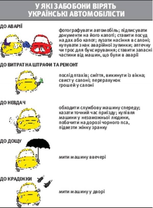 У водіїв є півсотні забобонів. Застерігають від аварій, штрафів і поломок. Після покупки машини у її салон кидають монету, щоб потім не витрачатися на ремонт. Нове авто не фотографують, щоб на сфотографованій деталі не з'явилася подряпина. На капоті та багажнику не підписують документи. Вірять, це до аварії.