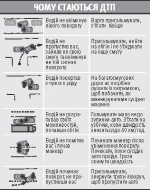 Директор центру контраварійної підготовки "Кордапрофі" 32-річний Євген Середницький радить, як уникнути аварії. Вмикати ближнє світло фар. Це робить авто помітнішим. Частіше перевіряти тиск у колесах. Восени він падає. Малий тиск збільшує гальмівний шлях, спричиняє заноси. Спускатися з гори на передачі, гальмувати двигуном. Це не дає машині прискорюватися, збільшує час для реакції водія на раптову перешкоду. Уникати різких рухів. Перед ямами збавляти швидкість. Пригальмовувати на крутих поворотах і пішохідних переходах. Триматися середнього ряду. Правий ряд призначений для громадського транспорту та паркування авто. Виїжджаючи, вони можуть спровокувати аварію. Дистанцію до переднього авто тримати хоча б 30 м. Гальмівний шлях на всесезонних шинах восени збільшується втричі. Пропускати водіїв, що роблять різкі маневри.