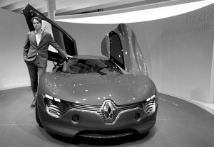 Показують два десятки електромобілів. Французька "Рено" розробила дві машини. Електричне міні-авто "Рено Зое" має краплеподібний кузов. Машина завдовжки 4 м важить 1,4 т. Елекродвигун на 80 к. с. живиться від двох батарей. Повна зарядка від домашньої розетки триває 6 год. Заряду вистачає на 160 км. 10 хв. вистачить, щоб мати запас ходу 65 км. "Зое" почнуть виробляти 2012 року.
