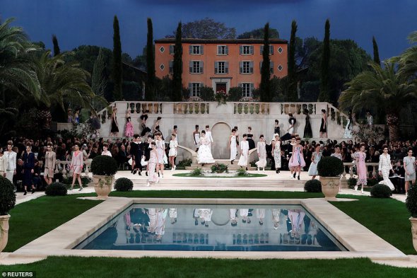 Подіум пролягав перед фасадом вілли. На передньому плані були басейн і зелень, що оточувала шлях моделей.