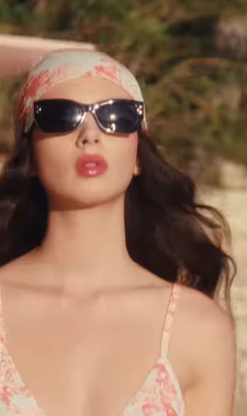 Образ доповнила хусткою у тон і ніжним макіяжем зі стрілками. Зйомки ролика відбувалися на тлі моря.
