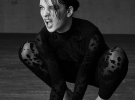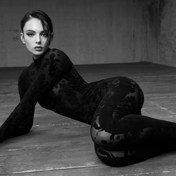 Перед камерою модель постала в прозорому комбінезоні з квітковим принтом, шкіряному пальто та панчохах.
