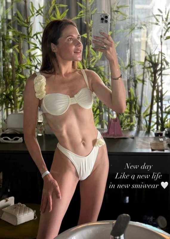 Жінка позувала в кремовому купальнику з нашитими квітами, який підкреслив її струнку фігуру.