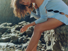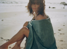 Крім цього жінка постала перед камерою у ковдрі та чорному бікіні. Пляжний образ доповнила природніми локонами та нюдовим макіяжем.