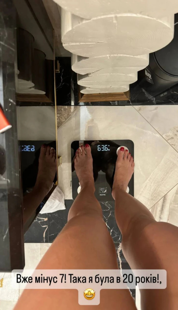 "Вже мінус сім. Я така була в 20 років", - зазначила артистка й показала ваги з цифрою 63,6 кг.