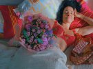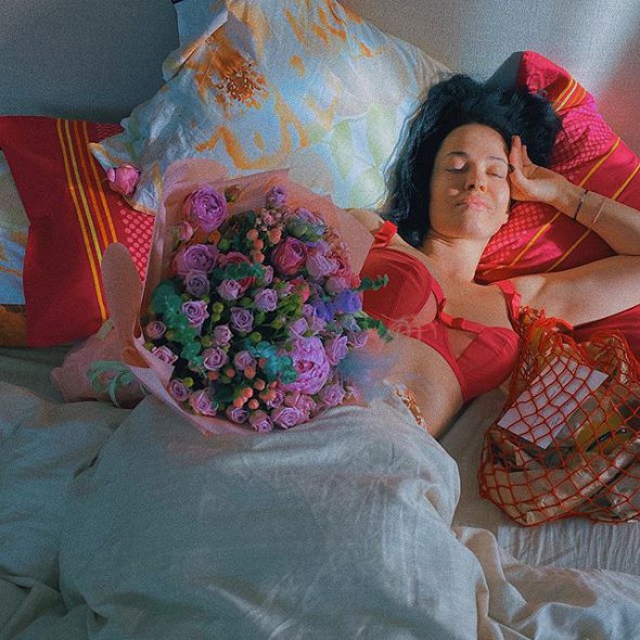 Співачка і модель Даша Астаф'єва поділилася світлиною з ліжка, де вона лежить в червоній білизні із рожевим букетом троянд. Поряд - авоська із продуктами і запискою із зізнаннями у любові.
