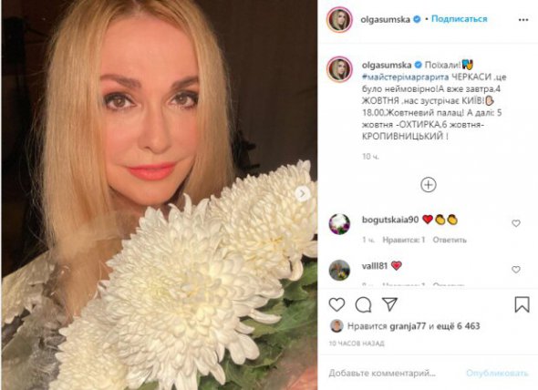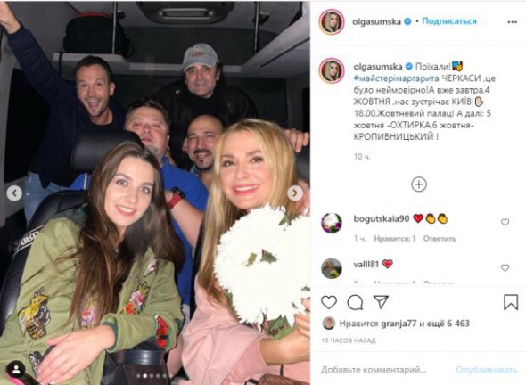 "Поїхали! #майстертамаргарита Черкаси, це було неймовірно! А вже завтра, 4 жовтня, нас зустрічає Київ!" - підписала фото Сумська.