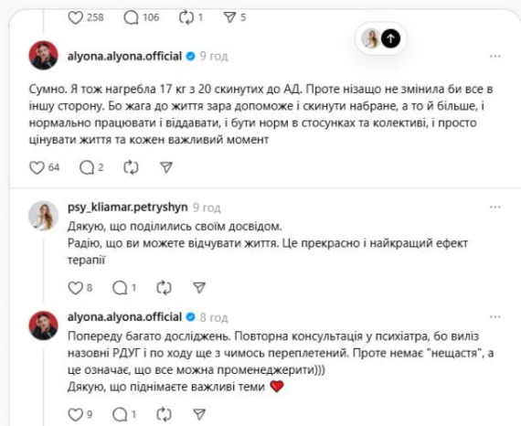 "Я нагребла 17 кг з 20 скинутих до антидепресантів. Проте, нізащо не змінила б все в інший бік. Бо жага до життя зараз допоможе і скинути набране, а то й більше, і нормально працювати і віддавати, і бути норм в стосунках та колективі, і просто цінувати життя та кожен важливий момент", - поділилася зірка.