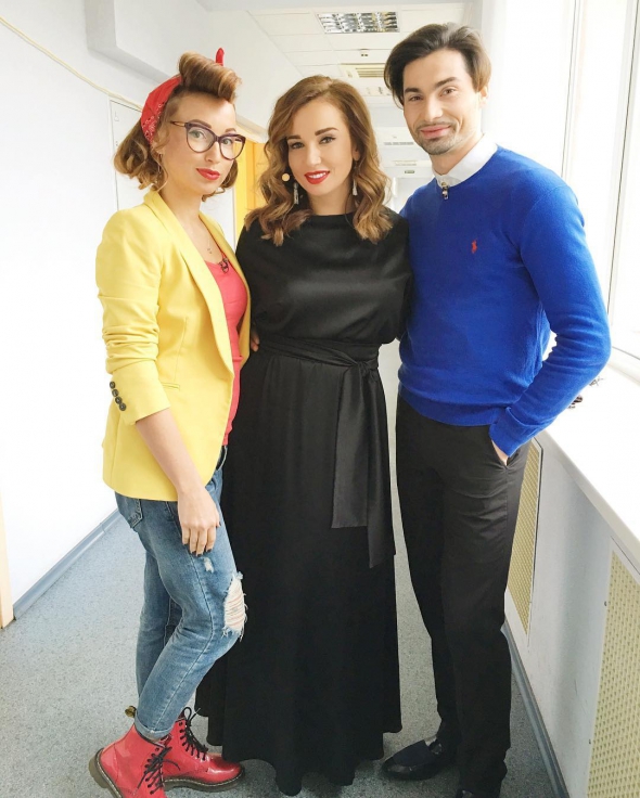 "Ну, що, скоро доведеться включати свою інтуїцію! На шоу "СуперІнтуїція" без цього ні як З такою шикарною жовто-блакитної групою підтримки мені нічого не страшно! Марішаmarynaaristova з якою ми подружилися на зйомках першого "Холостяка" і мій нереально круто танцюючий партнер по "Танцях з зірками в Україні" Віталій Загоруйко)))", - підписала фото Анфіса Чехова.
