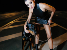Одягла чорну шкіряну мінісукню та чоботи на шпильці. Аутфіт доповнила ефектом мокрої укладки, яскравим макіяжем і сумкою відтінку металік.