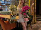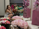 Крім цього, зробила селфі в дзеркалі на тлі великих букетів з півоніями.