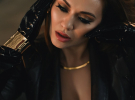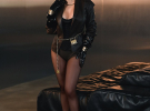 Перед камерою постала в напівпрозорому боді з глибоким декольте, колготках і шкірянці.