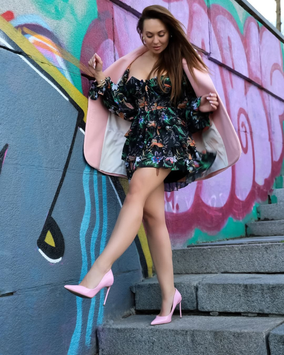 Перед камерою постала в короткій принтованій сукні та туфлях на підборах.